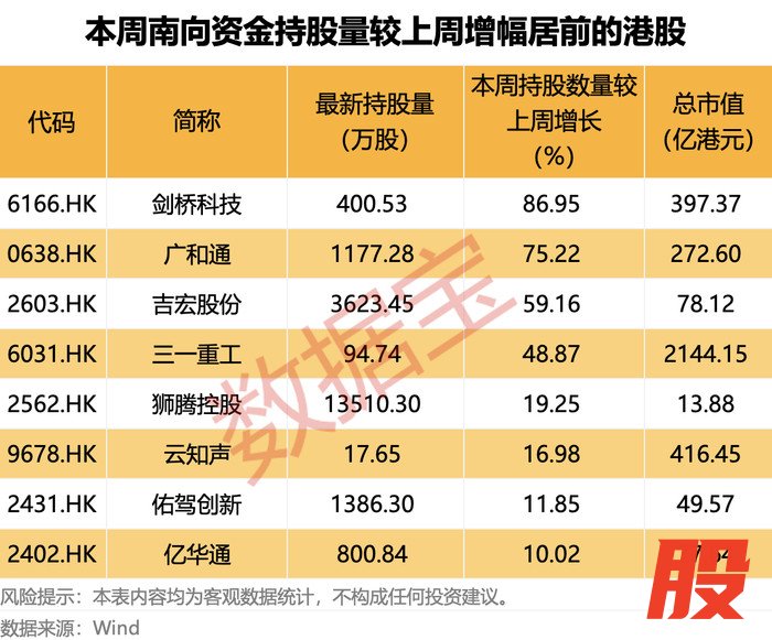 从持股量变化来看,本周8股获得南向资金持股量较上周增长超10%,其中剑桥科技居首,增幅为86.95%。其他还有广和通、吉宏股份、三一重工持股量增幅居前,较上周增长分别为75.22%、59.16%、48.87%。
