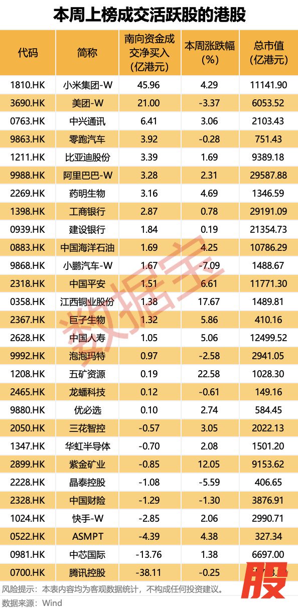 据证券时报·数据宝统计,本周南向资金合计成交净流入113.49亿港元,较上周下降42.8%,已连续29周净流入。
